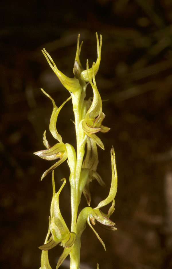 Found in Western Australia Australia in sparse to shrubby forests, winter wet seepage areas and on granite outcrops at elevations of 5 to 400 meters as a miniature to small sized, cold growing terrestrial with a single, linear to terete, elongate leaf that blooms in the winter through spring on an erect, 3.2" to 10" [8 to 25 cm] long, rachis 2.4 to 6" [6 to 15 cm] long, 5 to 30 flowered inflorescence carrying well spaced to moderately crowded flowers