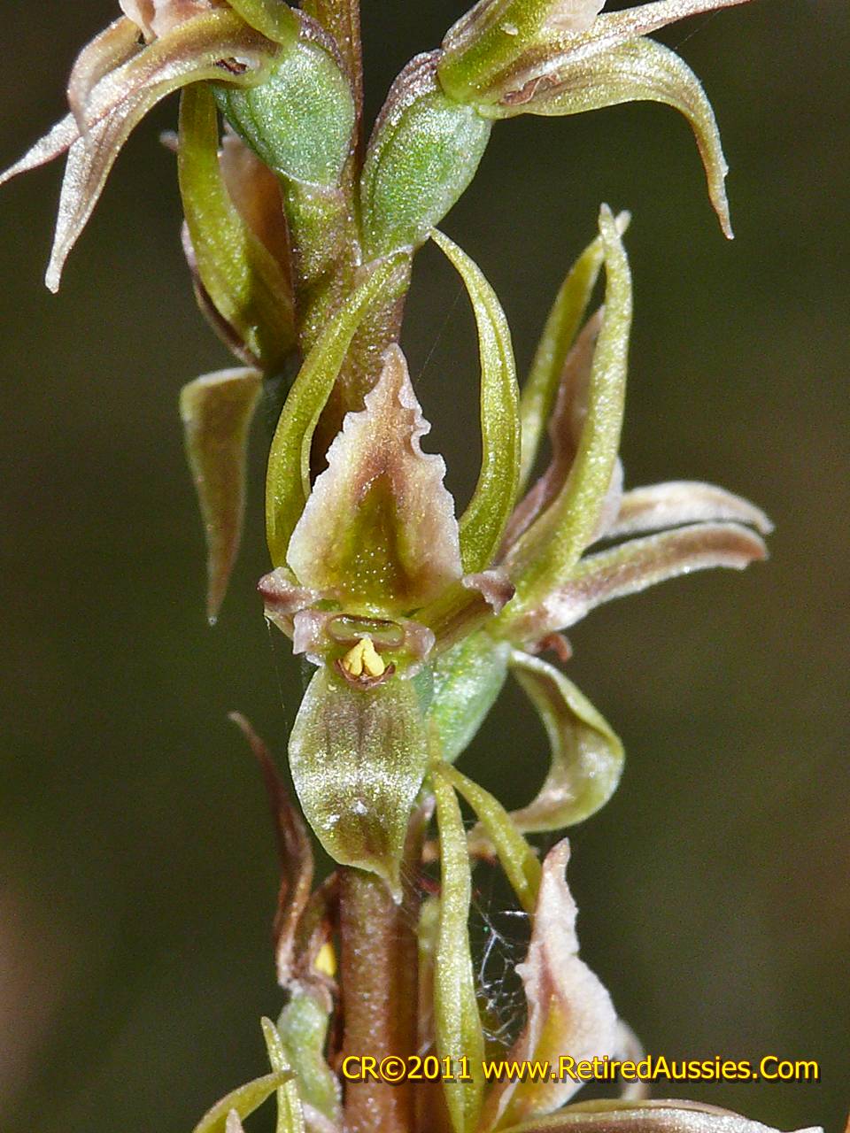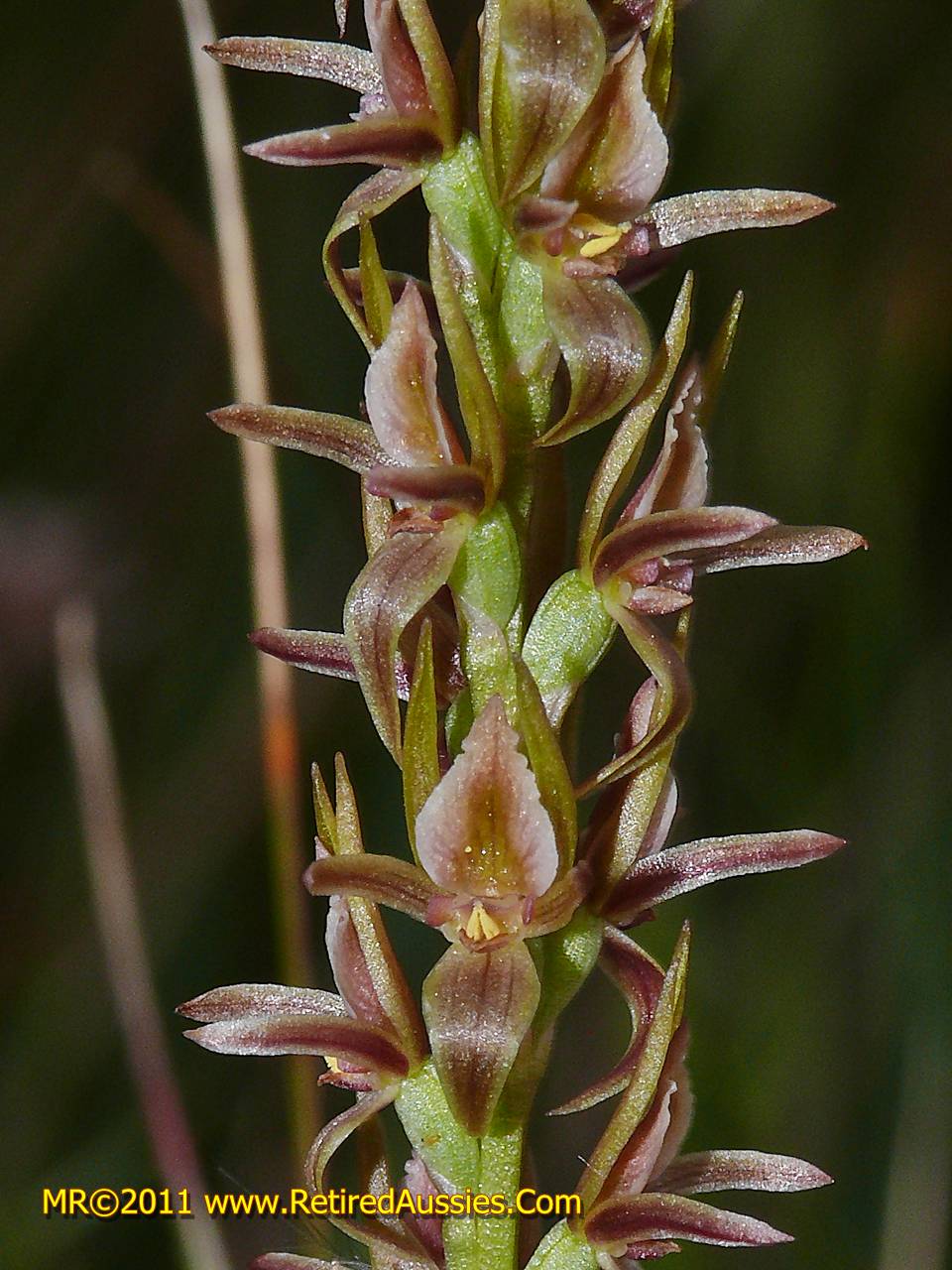 Found in New South Wales in grassy forests amd russock grasslands at elevations of 900 to 1000 meters as a small to medium sized, cold growing terrestrial with a single leaf that blooms in the late spring and early summer on an erect, 10 to 16" [25 to 40 cm] long ovarall, rachis 2 to 3.6" [5 to 9cm] long, 15 to 30 flowered inflorescence carrying crowded flowers