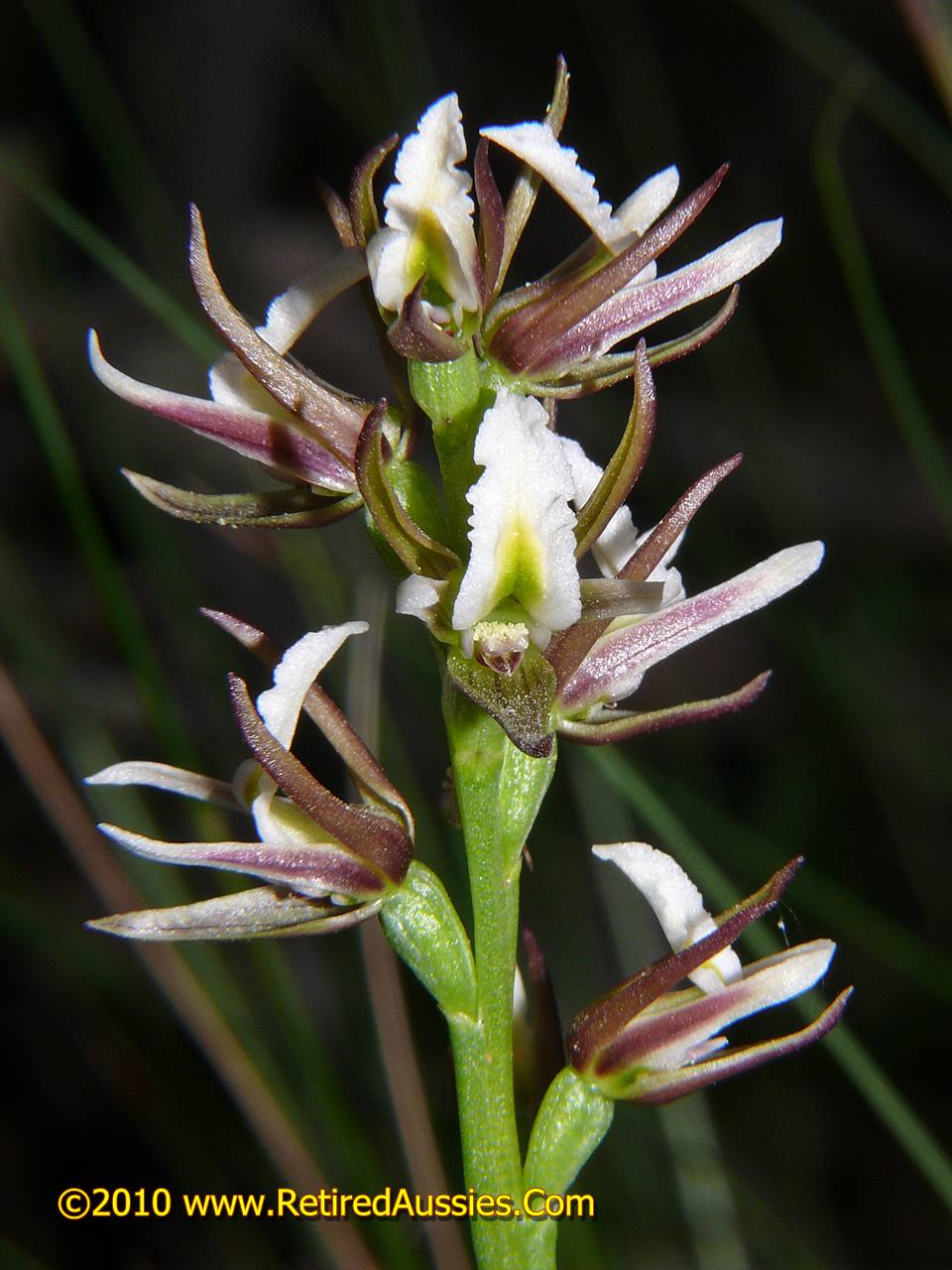 "This relatively recently described species is a member of the Prasophyllum odoratum group and distinguished from P. odoratum by its more robust habit and generally larger and more crowded flowers. The P. odoratum complex however remains a difficult group and the boundaries between several informal taxa within the group are unclear." The VicFlora Website