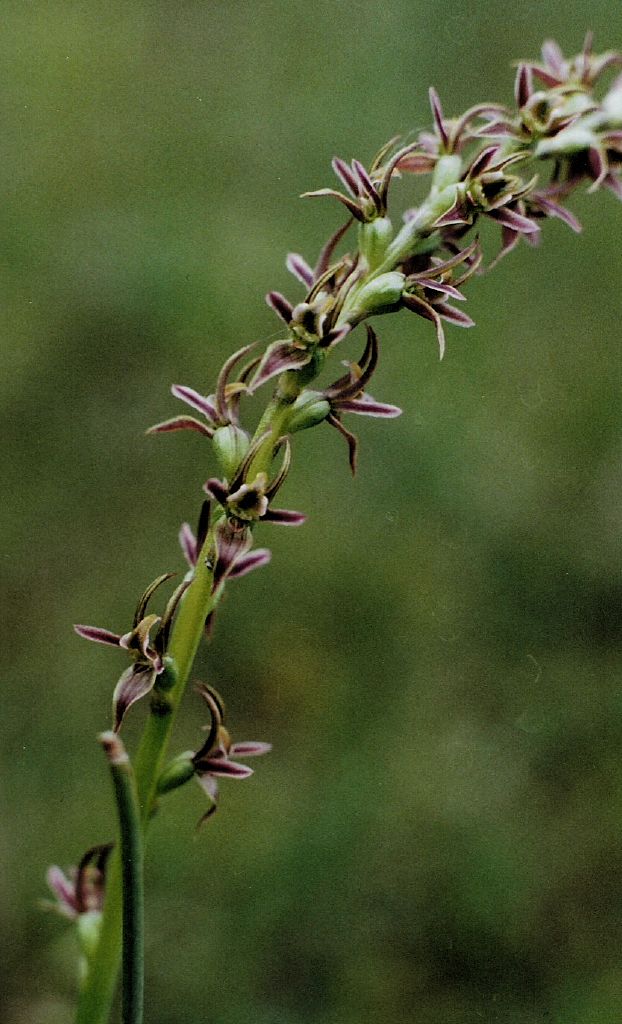 Found in Victoria Australia in grassy woodlands as a small sized. cold growing terrestrial with a single leaf that blooms in the spring on an erect, to 10" [25 cm] long, overall, rachis 2 to 4" [5 to 10 cm] long, 10 to 30 flowered inflorescence carrying fragrant flowers
