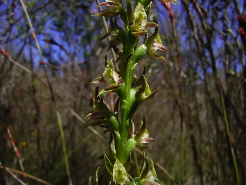 Found in South Australia in grassy and heathy forests at elevations of 200 to 400 meters as a medium to large sized, cold growing terrestrial with a single, stem clasping leaf that blooms in the spring on an erect, 14.8 to 24.4" [37 to 61 cm] long, 15 to 35 flowered inflorescence and carrying non-resupinate, scented flowers