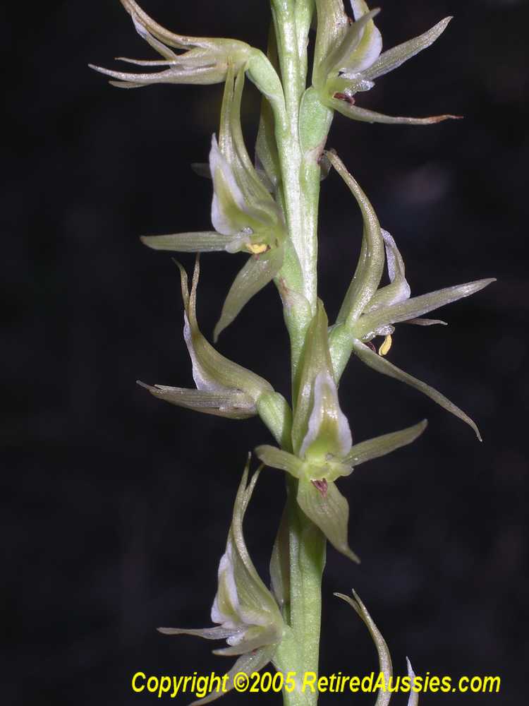 Found in Victoria and South Australia in woodlands at elevations of 300 to 550 meters as a small to medium sized, cold growing terrestrial with a single leaf that blooms in the spring in Australia on a 26" [65 cm] long, to 45 flowered inflorescence with successively opening, fragrant flowers.