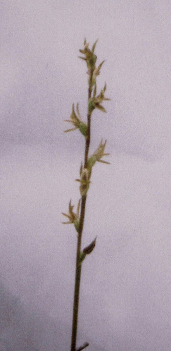 Found in Tasmania Australia on steep slopes and ridges in sparse grassy forests at elevations around 350 meters as a small to medium sized, cold growing terrestrial with a single leaf that blooms in the spring on an erect, 6 to 16" [15 to 40 cm] long, rachis 2.4 to 4" [6 to 10 cm] long, 7 to 15 flowered inflorescence carrying lightly scented flowers.