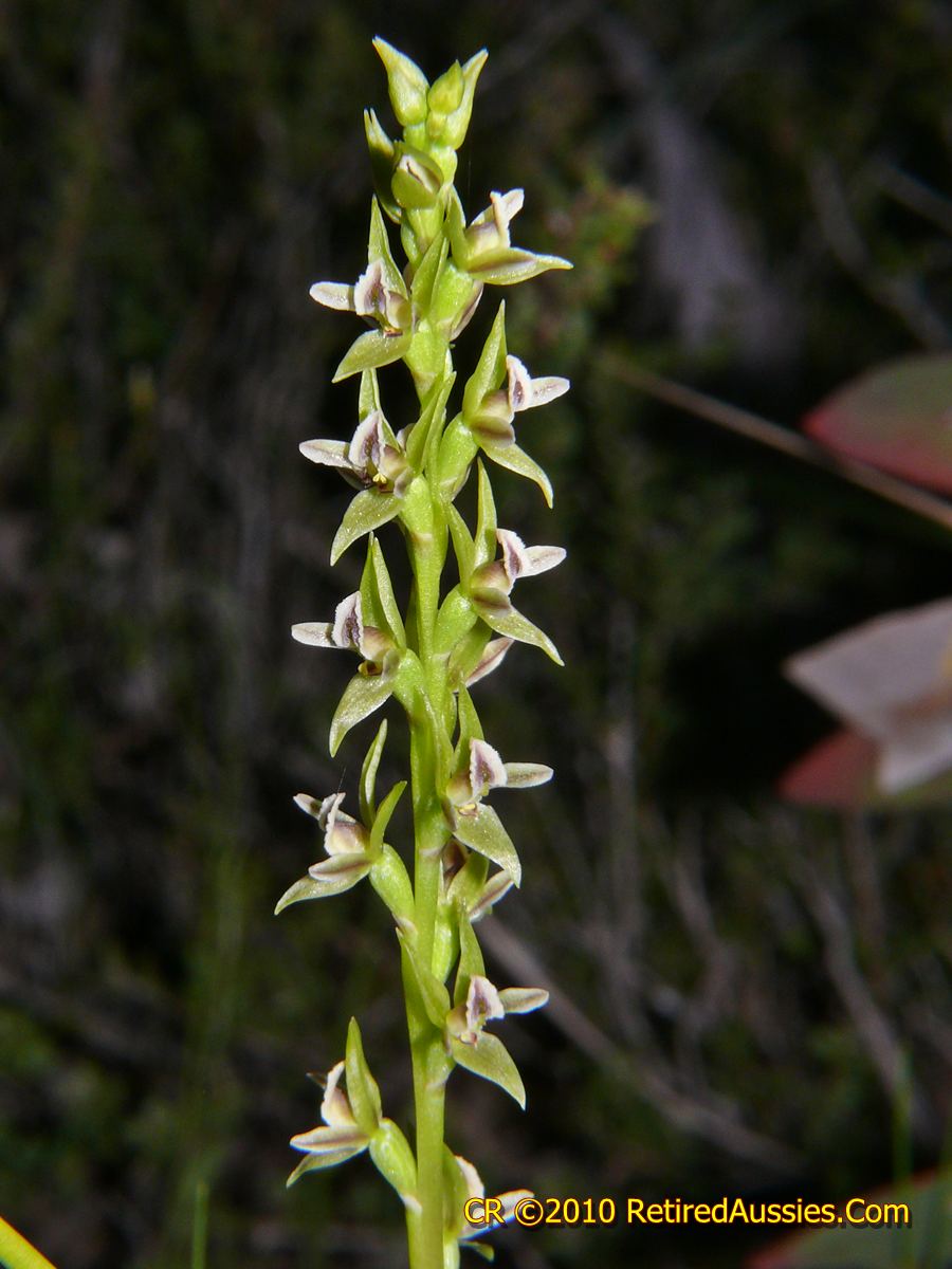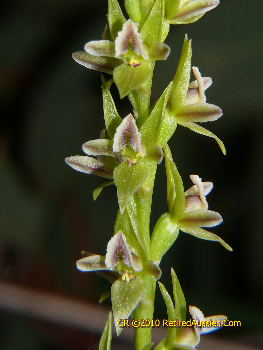 Found in Victoria and South Australia in heathy woodlands as a small to medium sized, cold growing terrestrial with a single leaf apically turning red at blooming, that blooms in the spring on an erect, 8 to 16" [20 to 40 cm] long overall, rachis 2 to 4" [5 to 10 cm] long, densely 10 to 30 flowered inflorescence carrying scented flowers