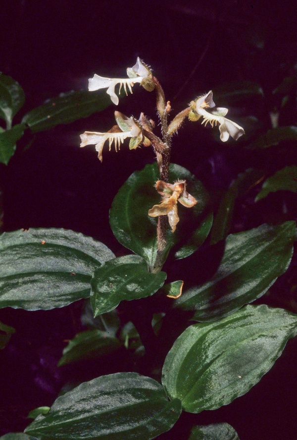 Found in Sumatra and Java in dark primary forests at elevations of 500 to 1800 meters as a small sized, hot to cool growing terrestrial orchid with 5 to 8, oval, shiny dark green with three main sunken veins, undulate margins, acute, leaves that blooms in the winter on an erect, to 3.6" [9cm] long, shortly pubescent, 3 to 6 flowered inflorescence with the flowers well spaced and with lanceolate, reddish brown floral bracts.