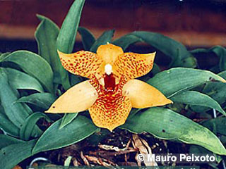 Found in Parana' state of Brazil as a mini-miniature sized, warm to cool growing epiphyte with long-ovoid, laterally compressed pseduobulbs enveloped basally by a few leaf bearing sheaths and carrying 2, apical, erect-patent, lanceolate, acuminate, attenuate below and conduplicate into the base leaves that blooms in the spring on a racemose, axillary, 1.1" to 1.4" [2.8 to 3.5 cm] long, single flowered inflorescence with long-ovate, acuminate, dorsally carinate floral bracts that are a bit shorter than the ovary.