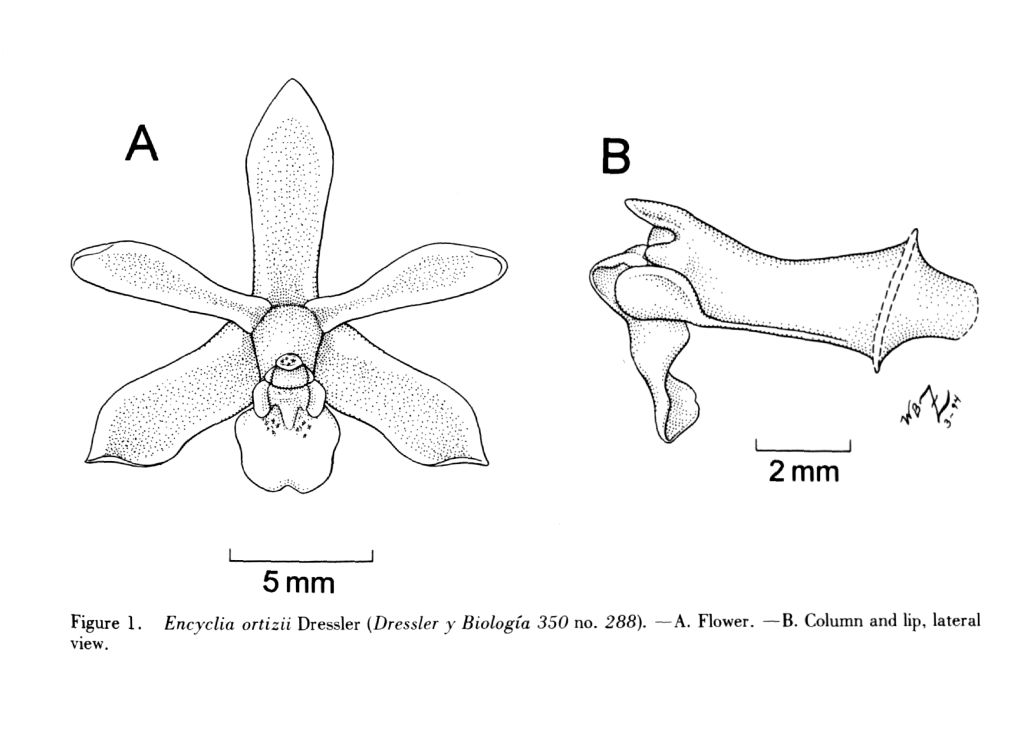 References W3 Tropicos, Kew Monocot list , IPNI ; Novon 5(2): 140. 1995. as Encyclia ortizii drawing fide; *Phytologia 82(5): 379. Higgins 1997[1998]; Manual de Plantas de Costa Rica Vol 3 Hammel, Grayum, Herrera and Zamora 2003; The Cattleyas and Their Relatives, the Debateable Epidendrum Withner and Harding 2004 photo fide;
