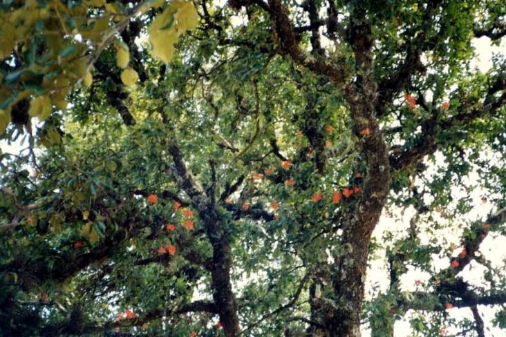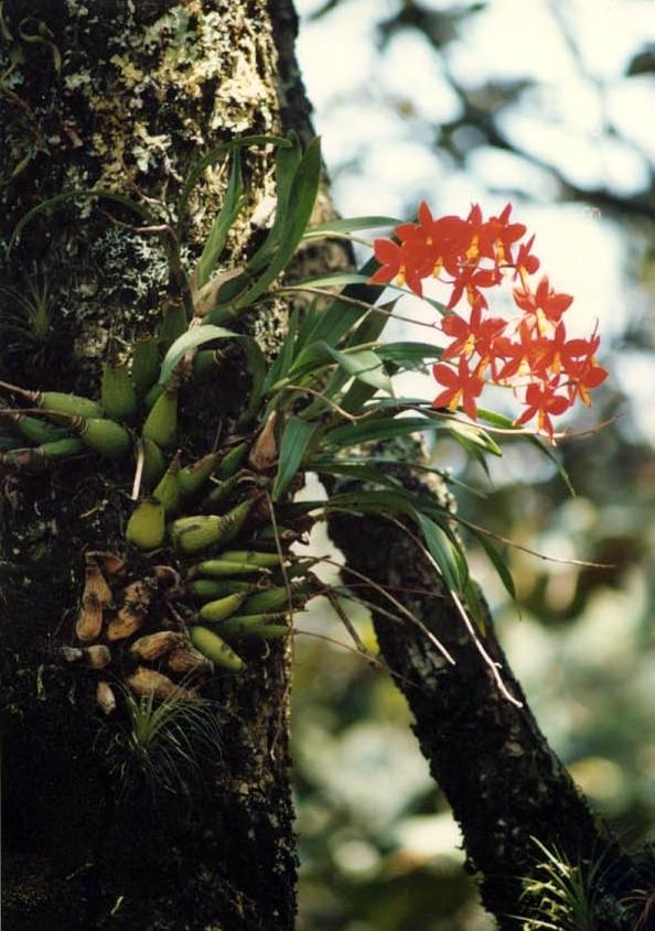 Found in Mexico, Nicaragua and Honduras, in oak, pine/oak, and scrub around lava flows and cloud forests at altitudes of 1400 to 2600 meters as a medium sized, cool to cold growing epiphyte that blooms in the spring through fall on a apical, 12" to 18" cm [30 to 45cm] long, simple to few branched inflorescence that has a basal sheath and arises on a mature, conical-ovoid, slightly compressed pseudobulb with two, apical, subcoriaceous, narrowly elliptic, obtuse leaves carrying 4 to 12, long-lived, orange to deep scarlet, showy, resupinate, wide open flowers and requires a dry winter rest ending with the onset of new growth in the early spring.