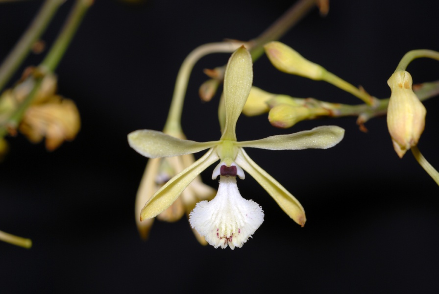 Found in Minas Gerais state of Brazil at elevations around 490 meters as a small to large sized, hot to warm growing rupicolus orchid with fusiform, 5 noded, smooth becoming rugose, enveloped by dessicated sheaths and carrying, apical, 3 to 6, alternate, rigid, coriaceous, variable in size, amplexicaul, lanceolate, slightly folded lengthwise, glabrous, margins membraneous and minutely serrate leaves that blooms in the fall on a terminal, paniculate, to 28" [70 cm] long, slightly flattened in crossection, greenish, successively several, many flowered inflorescence carrying very fragrant flowers with triangular floral bracts.