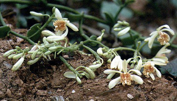 Found in Papua New Guinea , Queensland, and New South Wales in humus in grassy forests at elevations of 50 to 1000 meters as a giant sized [can get to 15 meters+ long], climbing, hot to warm growing, mycoheterotrophic, terrestrial orchid with an elongate, thick, glabrous, fractiflex, terete stem with laxly few, elliptic, coriaceous, rigid leaves and blooms in the spring on a simple or paniculate, 1/2" [1.25 cm] long, densely several [10 to 15] flowered inflorescence with minute, triangular, obtuse, floral bracts.