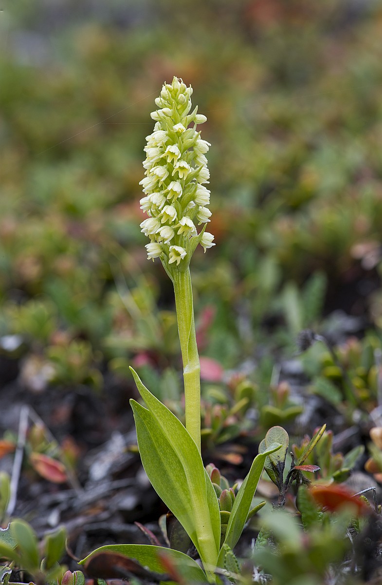 Found in Finland, Norway Sweden, The Faroe Islands , Iceland, Greenland, Newfoundland and Quebec provinces of Canada in limestone barrens and in moss mats near warm springs at elvations around 1000 meters as a mini-miniature to medium sized, cold growing terrestrial with a slender to stout, glabrous, leafy below the middle stem carrying 2 to 4, oblong-obovate to oblong-elliptic, obtuse to acute, basally clasping leaves that grade above to lanceolate bracts that blooms in the summer on a terminal, erect, spicate, cylindrical, 1 to 54" [2.5 to 10 cm] long, densely many flowered inflorescence with lanceolate, acuminate longer than the ovary floral bracts and carrying small, greenish yellow to greenish white, vanilla scented flowers.