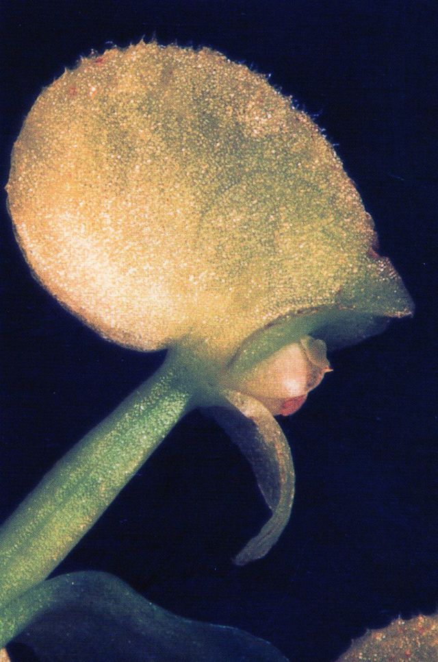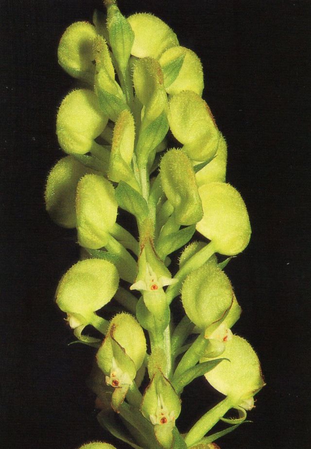 Found in Colombia and Ecuador at elevations of 2700 to 3200 meters as a medium to just large sized, cold growing terrestrial with to 7, basal, more or less rosulate, elliptic to ovate-ellioptic, rather criped margins, acute, gradually narrowing below in to the petiolate base leaves that blooms on an erect, overall to 2' [60 cm] long, rachis to 4.8" [12 cm] long, densely cylindric, many flowered inflorescence that is remotely 4, foliaceous sheathed, with ovate to ovate-lanceolate, acute floral bracts.