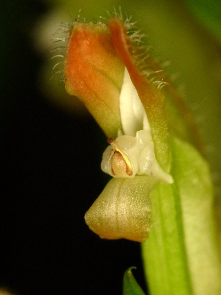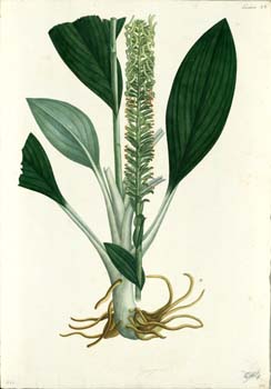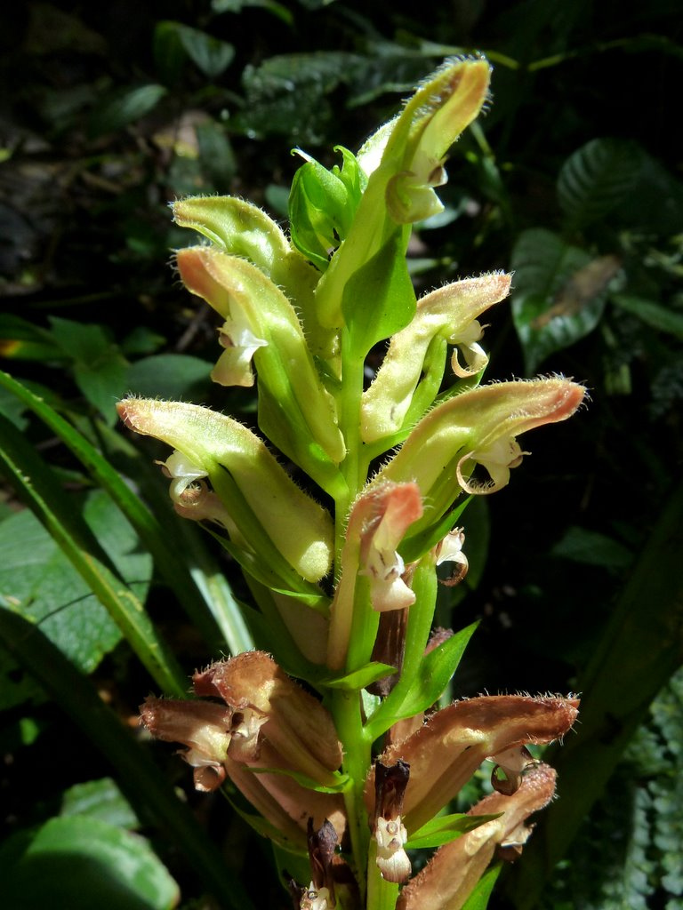 Found in Colombia, Ecuador and Peru in cloud forests as a medium to just large sized, cold growing terrestrial with a stout, erect stem carrying, 3 to 4 basal, herbaceous, ovate-lanceolate, acute, tapering below into the elongate, thin, striate, conduplicate sheathed base leaves that blooms on an erect, 2' [60 cm] long, cylindric, glabrous, densely many flowered inflorescence with ovate-lanceolate, acute to subacuminate, as long or longer than the ovaries floral bracts