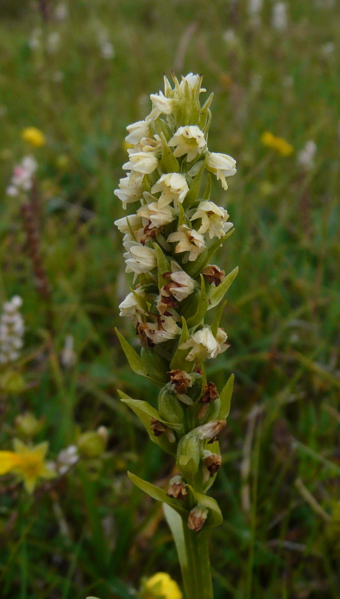 Found in Denmark, Finland, Great Britain, Ireland, Iceland, Norway, Sweden, Austria, Belgium, Czechloslaovakia, Germany, Neteherlands, Switzerland, Poland, Spain, France, Italy, Yugoslavia, Bulgaria, Romania, Ukraine, eastern Russia, Greenland, Newfoundland and Quebec in grasslands, montane fens and open woodlands at elevations up to 1000 meters as a small to just medium sized, cold growing terrestrial orchid with a short stem carrying 3 to 7, oblong-elliptic to lanceolate, near erect, positioned all aong the stem leaves with the uppermost 2 to 3 being bract-like and are equal to or longer than the ovaries that blooms in the late spring and early summeron an erect, 1 to 3" [2.5 to 7.5 cm] long, densly many flowered, spire-like, racemose inflorescence with lanceolate, longer than the ovary floral bracts..