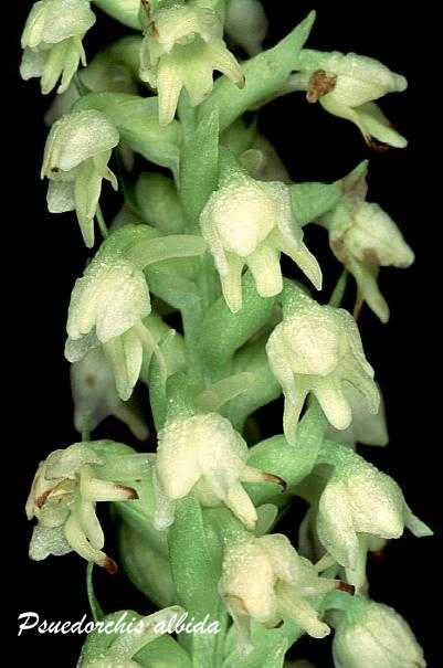 Synonyms Bicchia albida [L.] Parlatore 1858; Bicchia albida var. tricuspis (Beck) E.G.Camus 1908; Blephariglottis albiflora Raf. 1837; Chamorchis albida [L.] Dumort. 1827; Coeloglossum albidum (L.) Hartm. 1820; Entaticus albidus (L.) Gray 1821; Gymnadenia albida (Linne) Richard 1817; Gymnadenia albida f. minor Zapal. 1906; Gymnadenia albida f. subalpina Neuman 1901; Gymnadenia albida subsp. straminea (Fernald) Lřjtnant 1978; Gymnadenia albida var. borensis Zapal. 1906; Gymnadenia albida var. tricuspis Beck 1890; Gymnadenia aschersonii Brügger ex M.Schulze 1904; Habenaria albida (Linne) R. Br. 1813; Habenaria densiflora Schur 1866; Habenaria transsilvanica Schur 1866; Leucorchis albida (L.) E.Mey. 1848; Leucorchis albida f. breviloba (Schltr.) Soó 1928; Leucorchis albida f. lucida (Fuss) Soó 1927; Leucorchis albida f. subalpina (Neuman) Soó 1927; Leucorchis albida f. tricuspis (Beck) Soó 1928; Leucorchis albida var. breviloba Schltr. 1919; Leucorchis albida var. tricuspis (Beck) Schltr. 1919; Leucorchis lucida Fuss 1866; Orchis albida [L.] Scopoli 1772; Orchis alpina [Seg.] Crantz 1769; Orchis parviflora Poir. 1798; Peristylus albidus (L.) Lindl. 1835; Platanthera albida (L.) Lindl. 1829; Pseudorchis albida subsp. tricuspis (Beck) E.Klein 2000; Pseudorchis albida var. tricuspis (Beck) Kreutz 2004; Pseudorchis alpina Ség. 1754; Pseudorchis tricuspis (Beck) Landolt 2010; *Satyrium albidum Linne 1753; Satyrium scanense L. ex Steud. 1821; Satyrium trifidum Vill. 1787; Sieberia albida (L.) Spreng. 1817