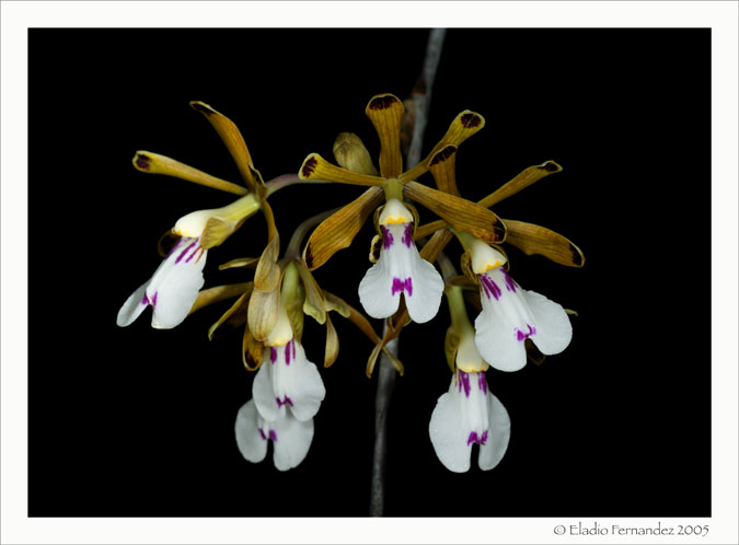 Found in the Dominican Republic at elevations of 275 to 1200 meters as a large sized, hot to cool growing epiphyte with crowded, slender, pyriform, transversly few-ringed pseudobulbs enveloped basally by several scarious sheaths and carrying lanceolate to ligulate, coriaceous, rigid leaves that have rounded, apiculate apice and bloom on a slender, to 4'2" [1.4 meters] long, racemose to few branched, laxly several flowered inflorescence arising on a newly matured pseudobulb and carries showy, fragrant flowers