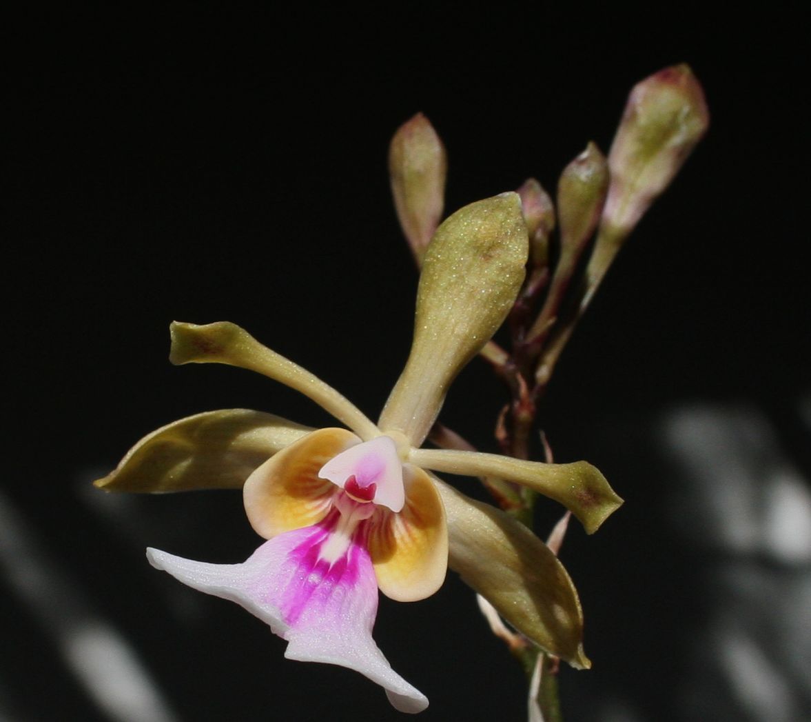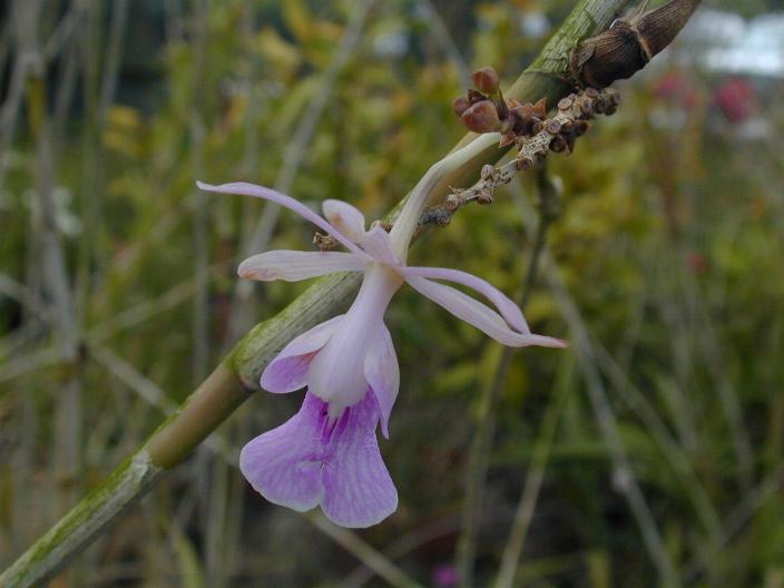 Found in the Virgin Islands and Puerto Rico as a small to medium sized, hot growing lithophyte or epiphyte at elevations of sea level to 340 meters with cylindrical, longitudinally rugose with age, 3 noded pseudobulbs enveloped basally by a few scarious sheaths and carrying 2 apical, linear, obtuse, basally clasping leaves that blooms on a terminal, to 5' [150 cm] long, arching, several to many flowered inflorescence that can rebloom for years and occuring at any time of the year but mainly March through August.