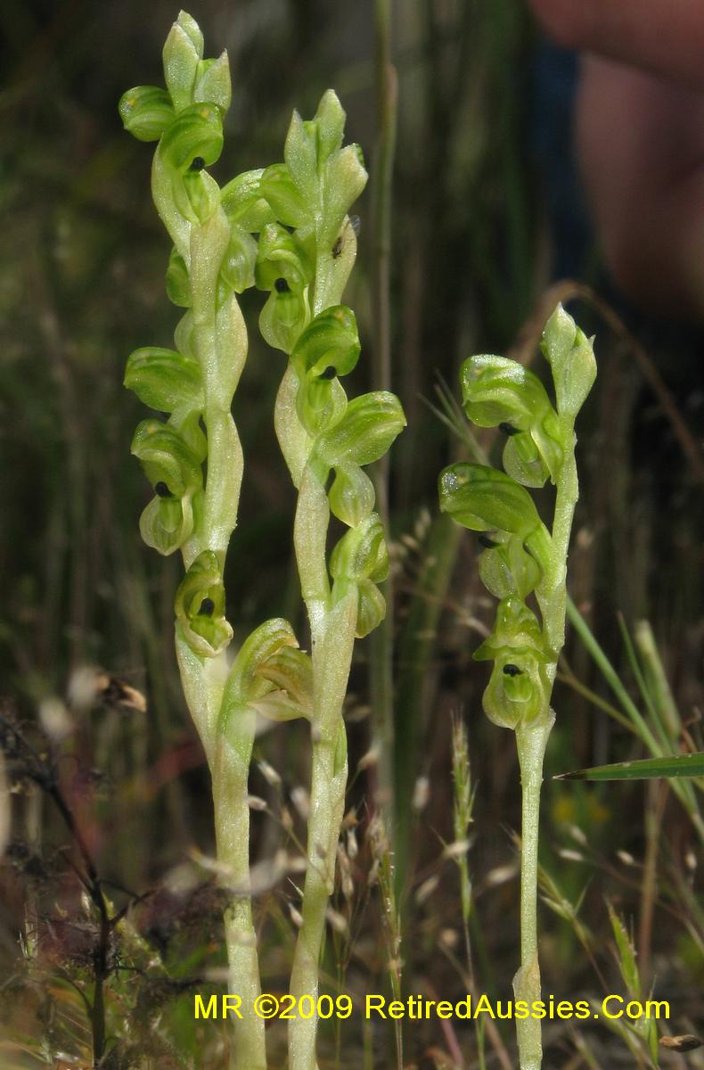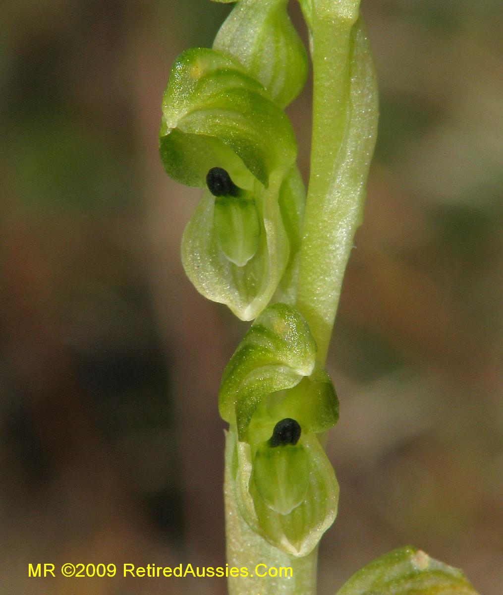 Found in Victoria Australia in basalt plains grasslands as a mini-miniature to miniature sized, cold growing terrestrial with 4 to 6, closely sheathing to spreading stem leaves and a rosette of 5 to 8, ovate-elliptic, shortly petiolate, crowded, margin entire leaves that blooms in the late winter and spring on an erect, 2 to 4.8" [5 to 12 cm] long, 3 to 14 flowered inflorescence
