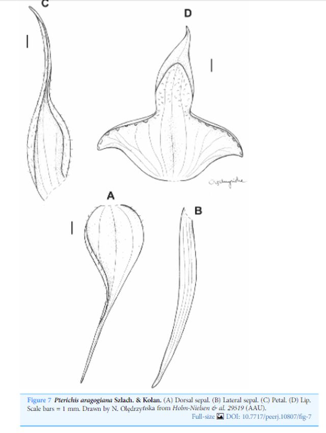 "Pterichis aragogiana is easily distinguished from all other genus representatives by the caudate sepals. Their lower part is more or less ovate and the upper one is rolled up along the margins forming a caudate, acuminate projection. Unlike in other species of the nominal section of Pterichis, the middle lobe of the lip of P. aragogiana constitutes ca. half of the total lip length." Kolanowska 2021