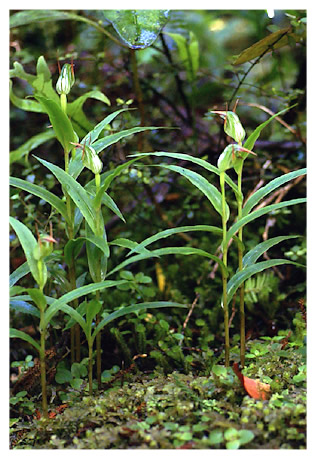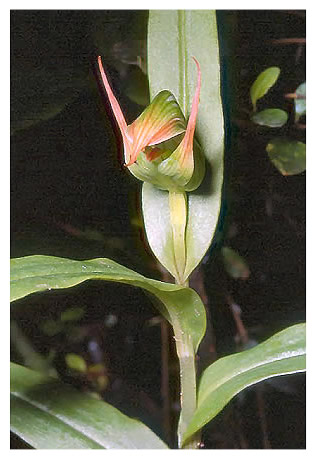 Found in the southern island of New Zealand in coastal to lowland forest and light scrub as a small sized, cold growing terrestrial with 3 to 4 long, broad, arched, wider than most Pterostylis leaves and blooms in the later winter through spring on an erect, single flowered inflorescence