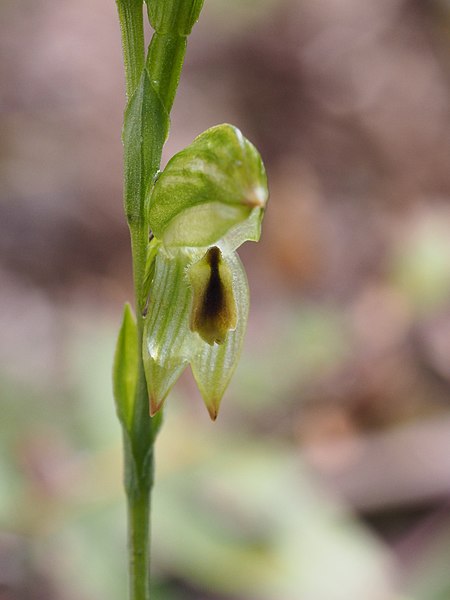 Found in New South Wales Australia in tall forests among shrubs adnd tussocks often on embankments at elevations of 900 to 1100 meters as a small sized, cold growing terrestrial with a short stem carrying 3 to 6, in a rosette leaves that blooms in the late fall and winter on an erect, 8 to 12" [20 to 30 cm] long, provided with 5 to 7 leaves that often have abrownish apex, 1 to 7 flowered inflorescence .