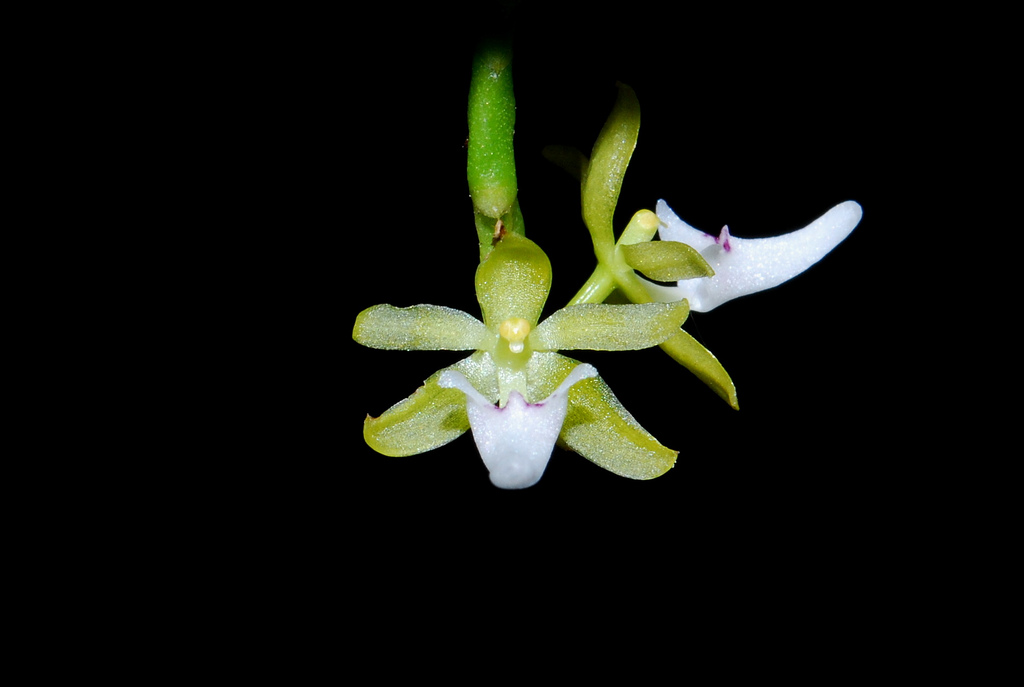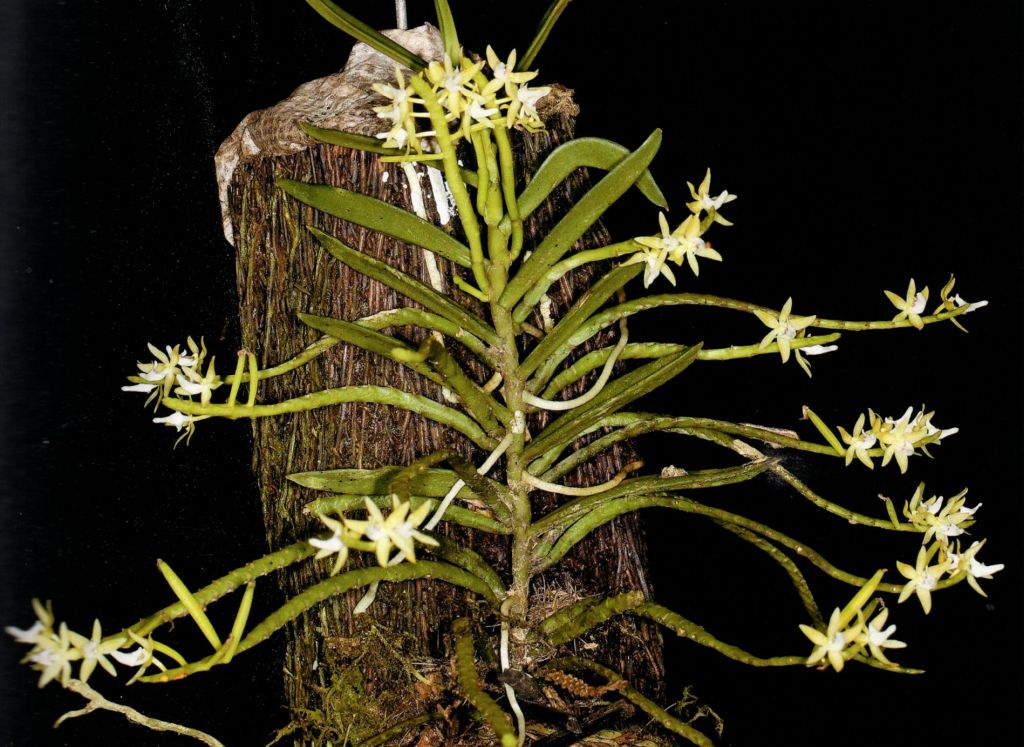 Found in Malaysia, Sumatra and Borneo in lowland forests at elevations around sea level to 500 meters as a medium sized, hot growing epiphtye with a prostrate stem carrying fleshy, sometimes slightly falcate, lanceolate, acute to minutely bifid leaves that blooms in the spring and summer on a distichously alternating, glabrous, laterally compressed, as long as the leaves or longer, peduncle, two edged, .88 to 2.1" [2.2 to 5.25 cm] long, rachis flattened, .81 to 3.4" [2.25 to 8.5 cm] long, successively single, several flowered inflorescence carrying flowers that smell of ylang-ylang.