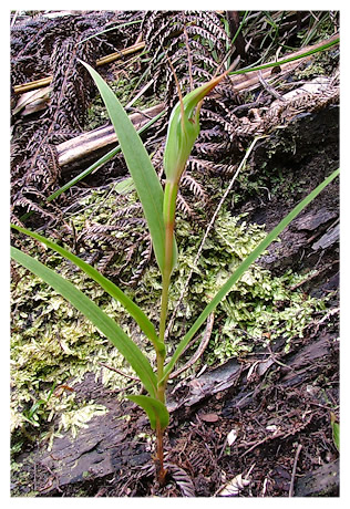 Found on the northern island as well as the northwest of the southern island of New Zealand in lowland to montane forests and scrub as a small sized, cold growing terrestrial with 4 to 6, stiff, straight, semi-erect, prominently keeled leaves that blooms in the mid spring on an erect, 1 flowered inflorecence.