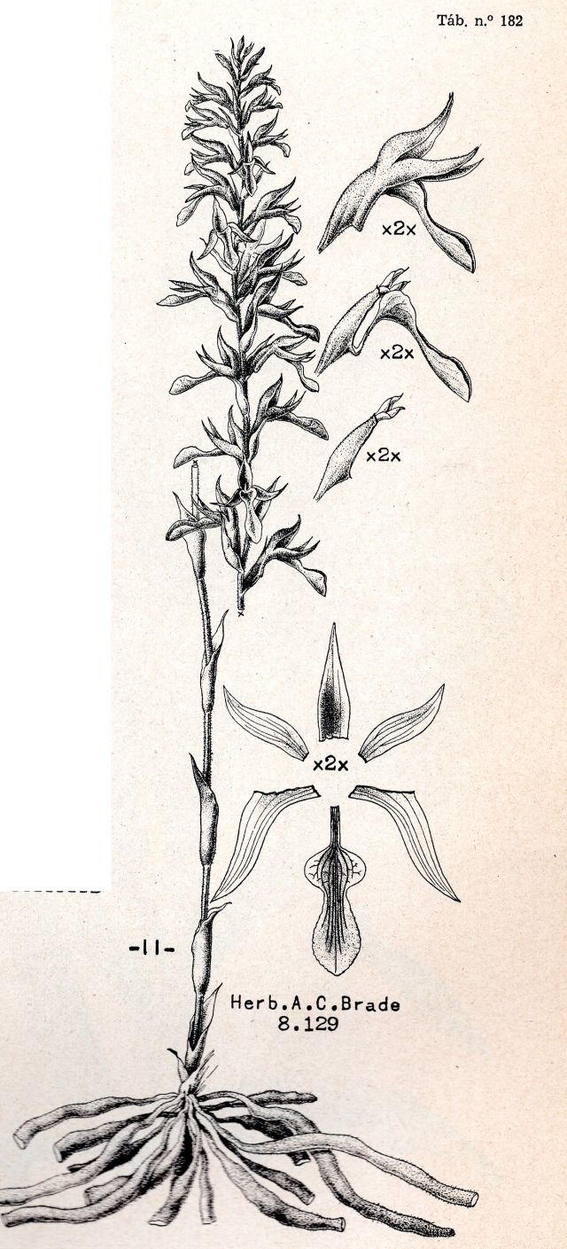 Found in southeastern Brazil as a small sized, warm growing terrestrial with erect, thin, glandular-pilose stem carrying bract-like, inflated, acuminate leaves that blooms in the spring on an erect, 2.4 to 6" [6 to 15 cm] long, many flowered inflorescence with ovate, acumiante, longer than the ovary floral bracts and carryijng sessile flowers.