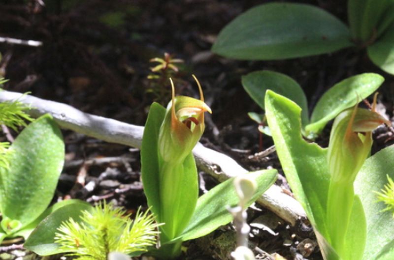 Found in the north Island of New Zealand in montane high elevations subalpine scrub as a mini-miniature sized cold growing terrestrial with a rosette of 3, rarely 2 or 4, elliptic, bluntly acute, blueish green leaves that blooms in the late spring and early summer on an erect. 1.8 to 2" [4.5 to 5 cm] long, single flowered inflorescence.