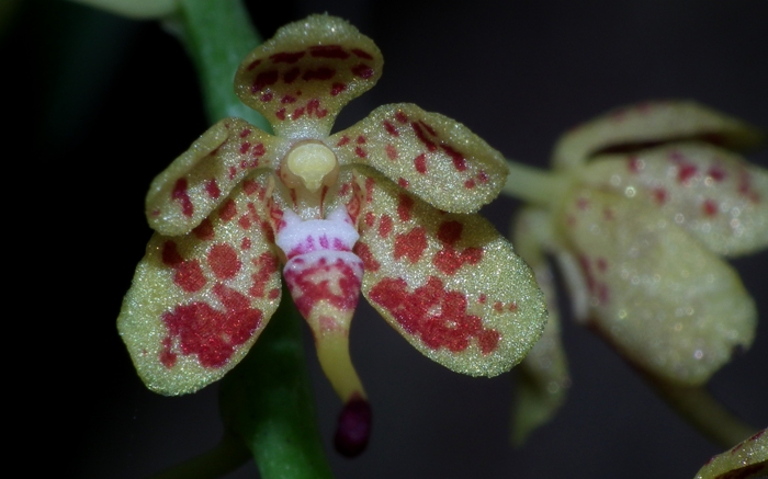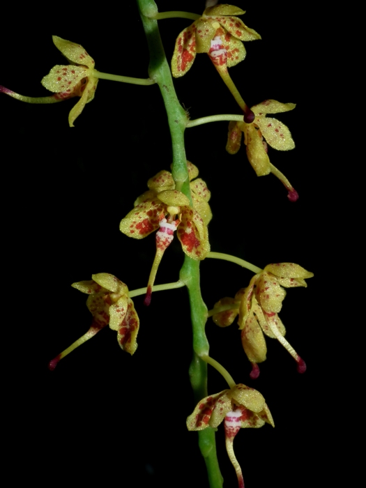 Found in the Philippines at elevations sealevel to 1000 meters as a medium sized, hot to warm growing epiphyte with an erect stem becoming pendant with age carrying leathery, linear to oblong leaves that blooms in the later spring and summer on a pendulous, to 3'4" [1 m] long, many [100] flowered inflorescence