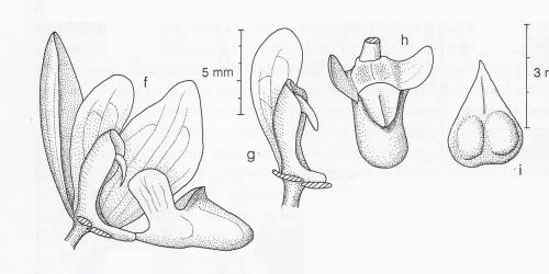 Found in Johor state of penninsular Malaysia and Sarawak Borneo in lowland primary riverine forests at elevations around 50 meters as a small sized, hot growing epiphyte with a straight stem carrying falcate, unequally bilobed to obtuse apically leaves that blooms on a slender peduncle that is 1.2" [3 cm] long, densely prickly, rachis to .4" [1 cm] long, finely prickly, spirally alternating, successively single, to 8 flowered inflorescence with dull yellowish tepals and a dull brownish crimson lip.