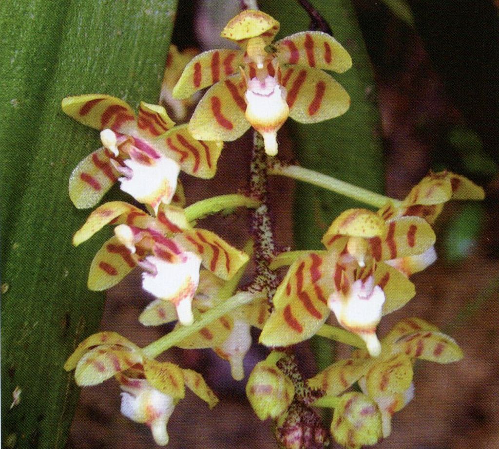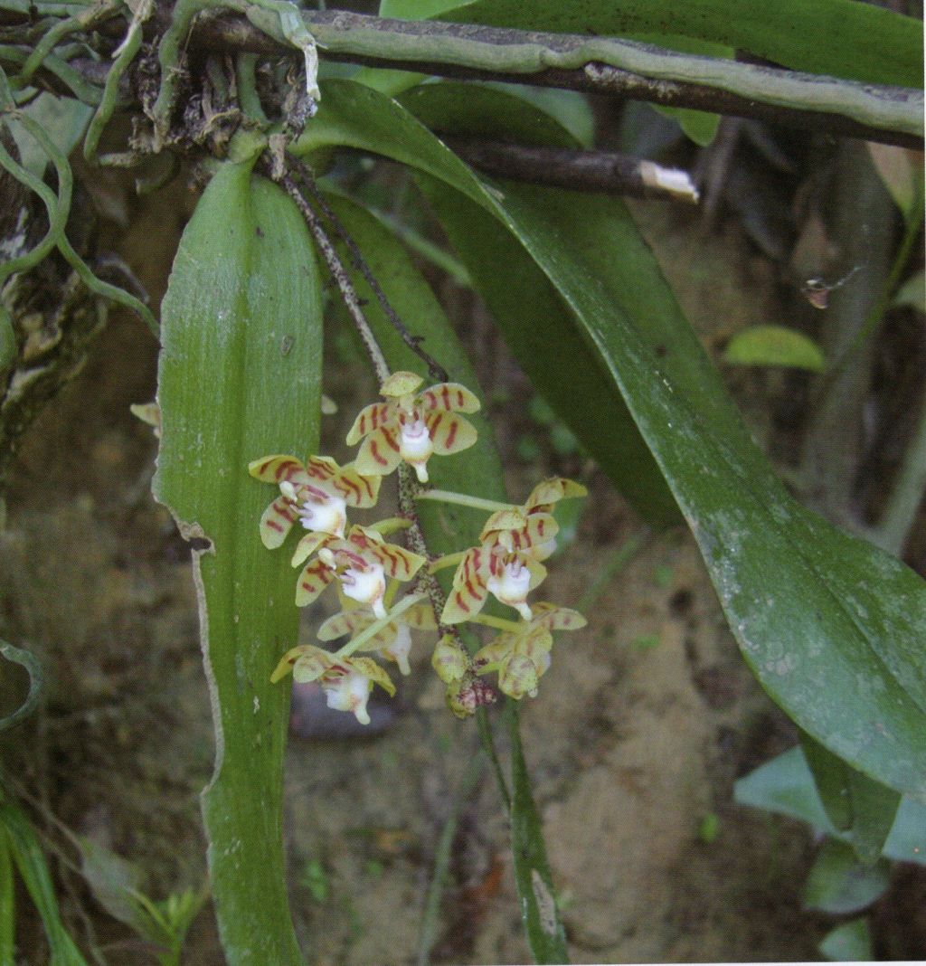 Found in the Andaman Islands as a mini-miniature to miniature sized, hot to warm growing epiphyte with a pendulous stem carrying fleshy-coriaceous, ligulate, apically unequally bilobed, cuneate below into the base leaves that blooms in the later spring on an axillary, as long as the leaf, 2 to 3" [5 to 7.5 cm] long, thin, red spotted, simultaneously 7 to 8 flowered inflorescence carrying fragrant flowers.