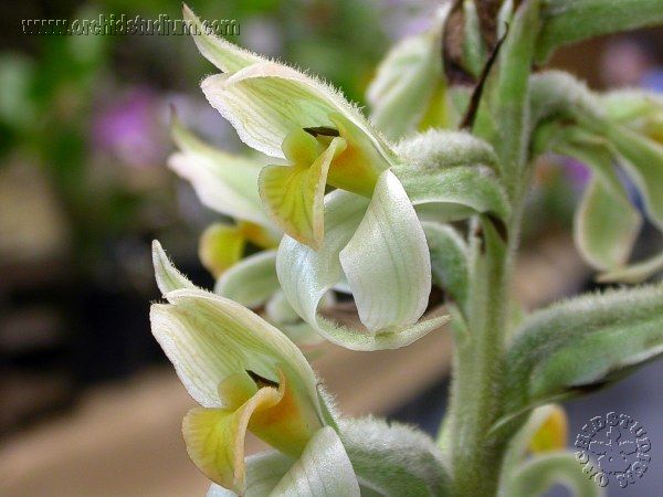 Found in Venezuela, Brazil and Paraguay as a medium to large sized, cold growing terrestrial with a large, rosulate, basal, oblong-lanceolate, acute to acuminate, dark green with the margins much lighter, erect to erect patent, sessile into the clasping base leaves that blooms in the spring as a new greowth arises, on a terminal, erect, 12 to 28" [30 to 70 cm ] long, glabrous below, puberulent-villous above, pale green, rachis 2.4 to 6" [6 to 15 cm] long, 6 to 15 flowered inflorescence with long-lanceolate, long acuminate, as long as the scented flowers floral bracts.