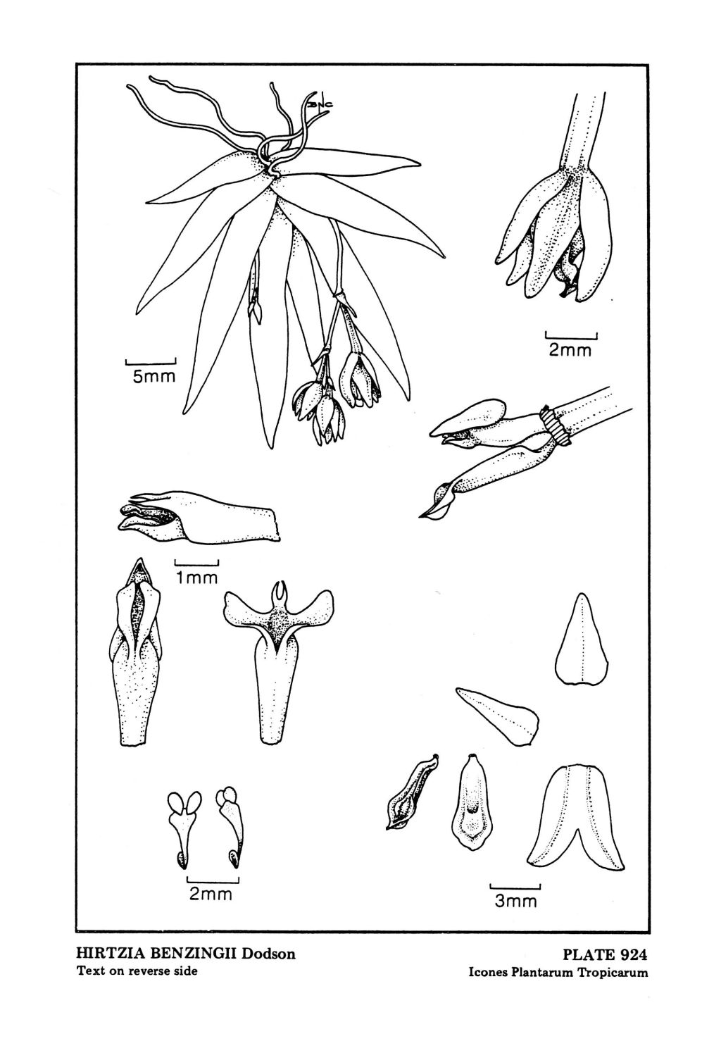 References W3 Tropicos, Kew Monocot list , IPNI ; Icones Planetarum Tropicarum Plate 924 Dodson 1984 as Hirtzia benzingii drawing fide; Rudolf Schlechter Die Orchideen Band 1C lieferung 32 1977 - 2056 Brieger 1996 as Hirtzia benzingii photo fide; Native Ecuadorian Orchids Vol 3 Dodson 2002 as Hirtzia benzingii drawing/photo fide; AOS Bulletin Vol 78 #4 2009 photo fide; Orchids A Colombian Treasure Vol 3 Ortiz & Uribe 2019 photo fide/drawing ok;