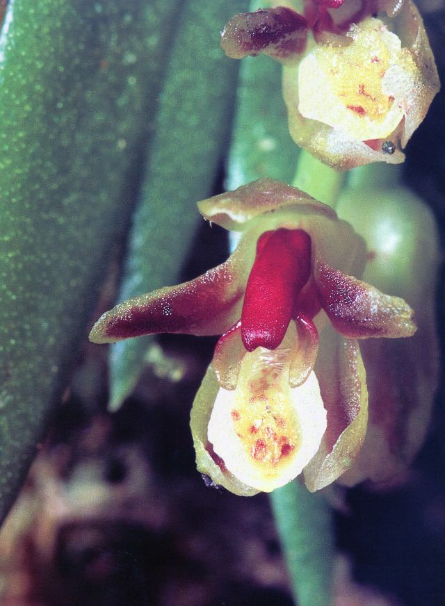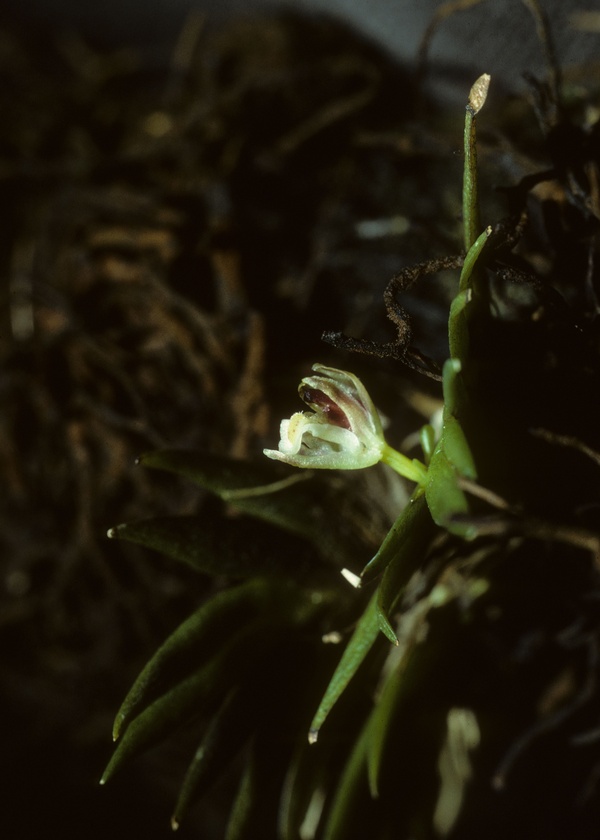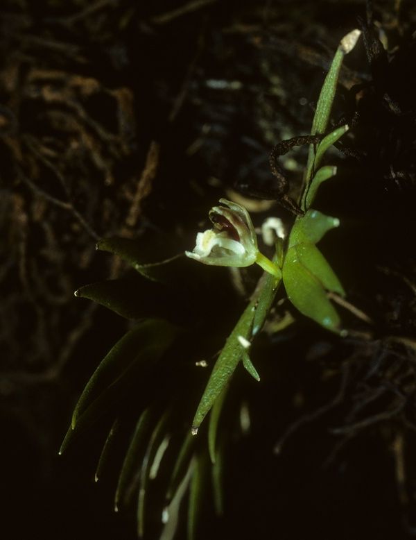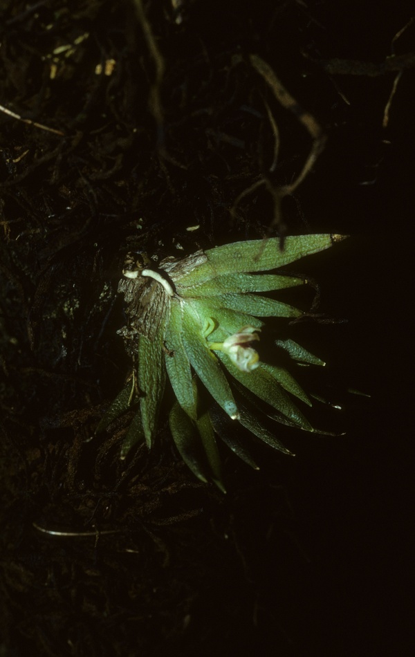 Found in southern Colombia and Ecuador in wet montane forsests on small twigs high in the canopy at elevations around 1850 meters as a mini-miniature sized, warm to cool growing epiphyte with a short stem carrying equitant, conduplicate, oblique, acuminate, basally clasping leaves that blooms in the later spring and early summer on an axillary, to 2" [to 5 cm] long, 3 to 5 flowered inflorescence with triangular floral bracts