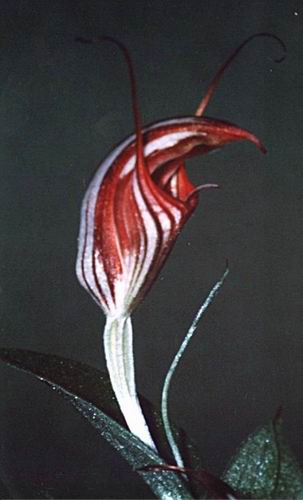 Found in Western Australia at elevations of 150 to 300 meters as a miniature sized, cold growing terrestrial with globose tubers giving rise to an erect stem completely enveloped by narrowly ovate, acute, basally clasping leaves going up the stem when in bloom and a basal rosette of ground hugging, blusish green leaves, that blooms in the fall and winter on an erect, 4" [10 cm] long, single flowered inflorescence that has flowers that get redder with age.
