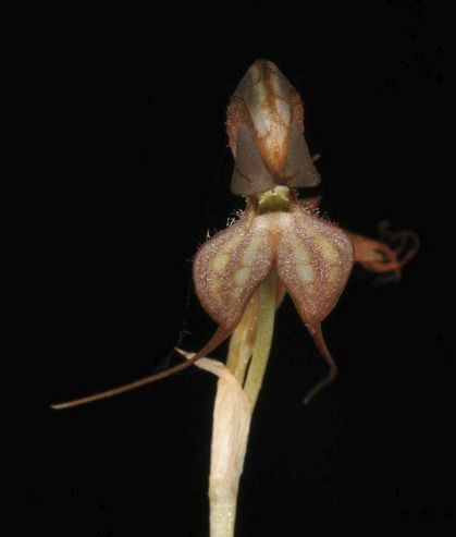 Found in southern New South Wales in sparse forests on a few isolated hills within rock crevasses and on leadges in well draining soils at elevations of 250 to 400 meters as a mini-miniature to miniature sized, cold growing terrestrial with 6 to 10 leaves that blooms in the winter through spring on an erect, 3.6 to 6" [9 to 15 cm] long, 1 to 8 flowered inflroescence carring flowers that project forward.