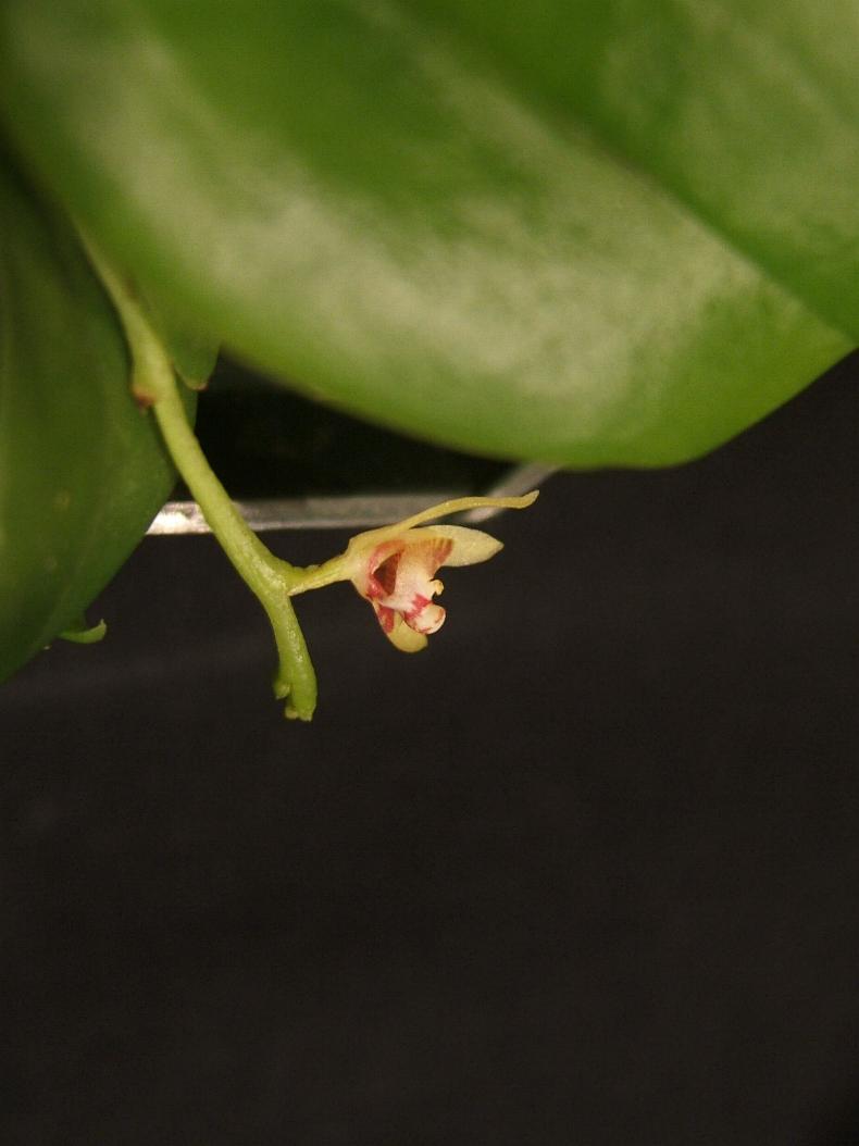 Found in Vietnam as a miniature sized, hot to warm growing epiphyte with an erect to decumben=t stem carrying 7 to 8, lanceolate, undulate margined, unequally bilobed apcailly, basally clasping leaves that blooms on an axillary, 2.4" [6 cm] long, thin, successively single to 2 flowered inflorescence.