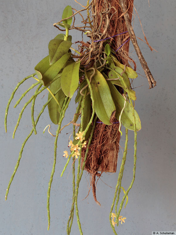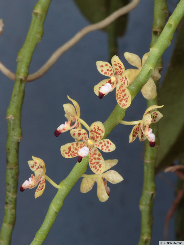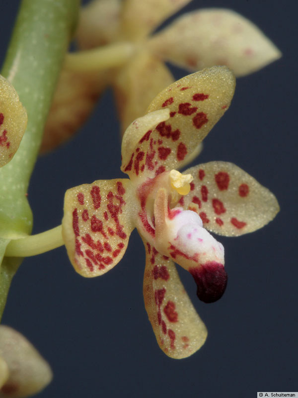 Found in Assam, Bangladesh, eastern Himalayas, Nepal, Bhutan, Thailand, Myanmar, Laos, Cambodia, Vietnam, Borneo, Java, Lesser Sunda Islands, Moluccas, the Philippines, Sulawesi and Sumatra in lowland, hill and lower montane forests forests at elevations of 500 to 1500 meters as a miniature to small sized, pendant, warm to cool growing epiphyte with an unbranched stem carrying 4 to 17, linear-oblong to lanceolate, oblique, 2 lobed, sessile jointed leaves that blooms in the winter and spring on 1 to 4, axillary, pendant, glabrous, .6" to 3" [1.5 to 7.8 cm] long, successively 5 at once, many flowered inflorescence enveloped basally by 1 to 4, small sheaths and the rachis is dilated with winged nodes and scale like floral bracts all carrying resupinate, fragrant, short-lived flowers.