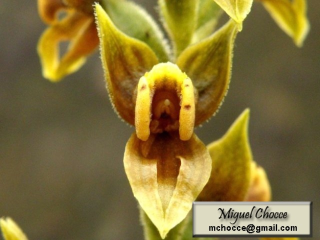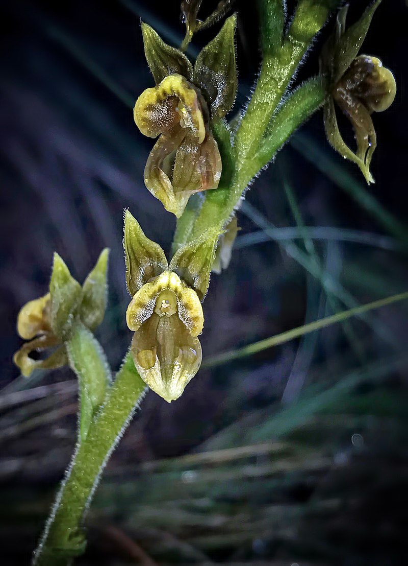 Found in Ecuador and Peru in moss on rocks at elevations of 2600 to 4100 meters as a small to large sized, cold growing terrestrial or lithophyte with a [when present] solitary or rarely 2, basal, oblong-elliptic, acute to subacute, gradually narrowing below into the petiolate base leaves that blooms in the later summer on a terminal, glabrous to sparingly glandular-tomentose, to 5.6" [14 cm] long, laxly to subdensely to 20 flowered inflorescence with several clasping, distant sheaths and has ovate to lanceolate-ovate, glandular-pubescent, usually shorter than the ovary floral bracts.