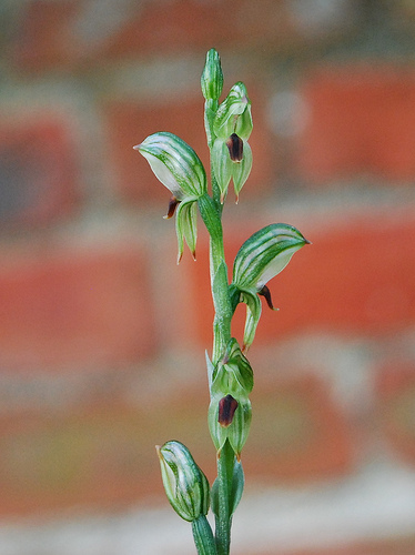 Found in Tasmania Australia in coastal forests under low shrubs abd bracken at elevations of 5 to 250 meters aas a mini-miniature to small sized, cold growing terrestrial with a short rosette stalk with 4 to 6 leaves that blooms in the late fall and winter on an erect, 4 to 12" [10 to 30 cm] long, provided with 5 to 6 stem leaves, 1 to 9 flowered inflorescence