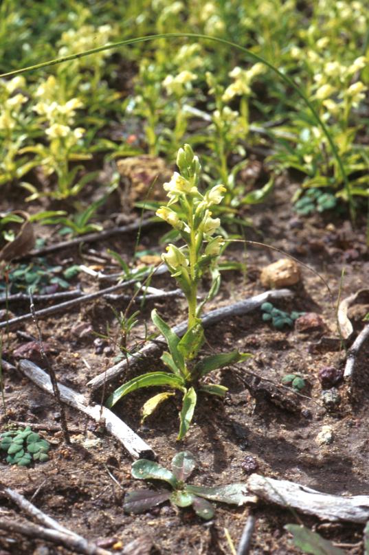 Found in southwestern and southern Cape Province of South Africa in short scrub at elevations of 30 to 900 meter as a slender, small sized, cold growing terrestrial with numerous, elliptic leaves that blooms in the late winter and spring on an erect, terminal, fairly dense, 4" [10 cm] long, 2 to many flowered inflorescence
