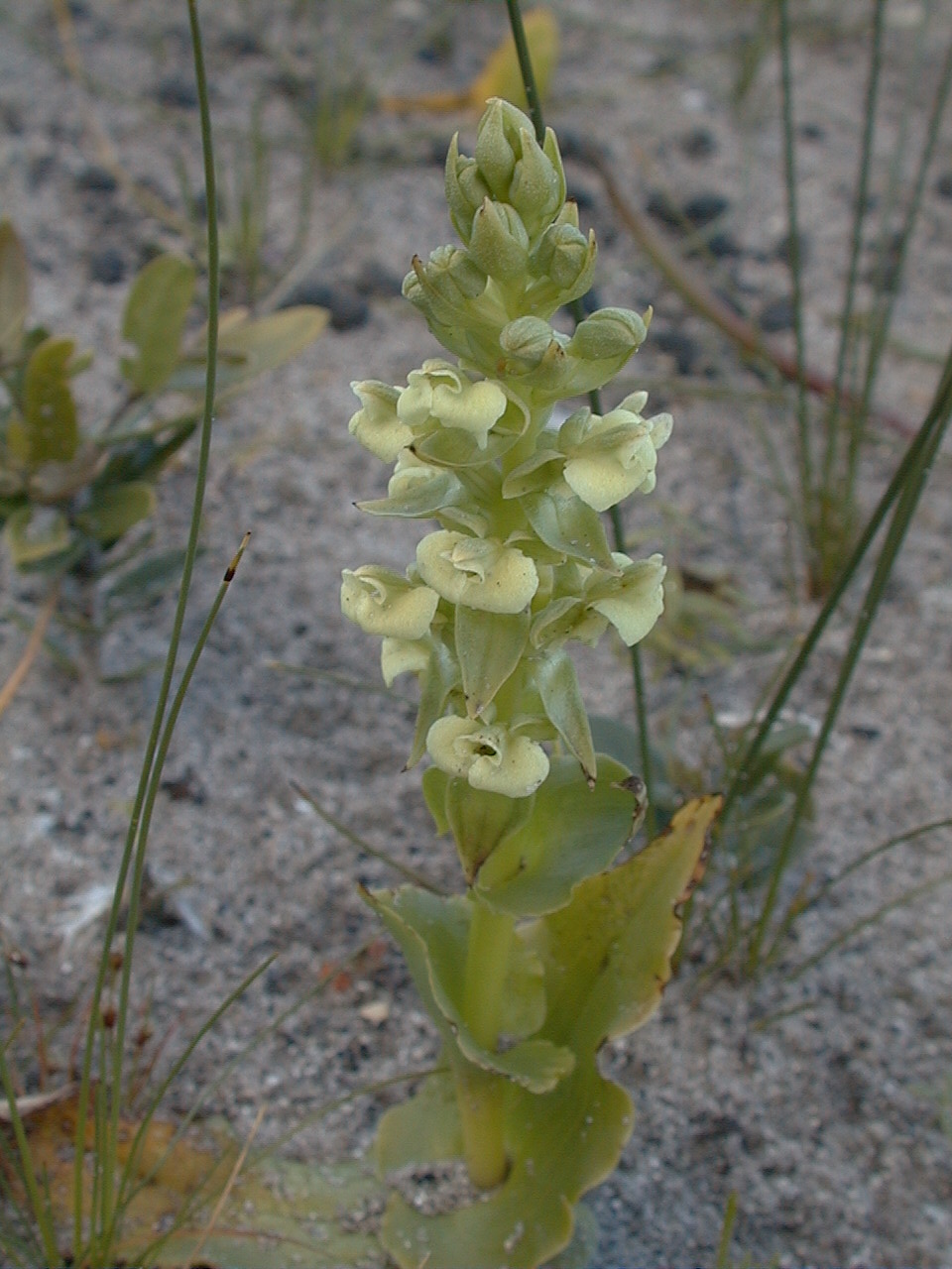 Found in southwestern and southern Cape Province, South Africa in sandy soils at elevations of sea-level to 900 meters as a slender, medium sized, cool to cold growing terretrial with 2 ovate-oblong leaves that blooms in the spring on an erect, terminal, lax to dense, many flowered inflorescence and carrying unpleasantly scented flowers