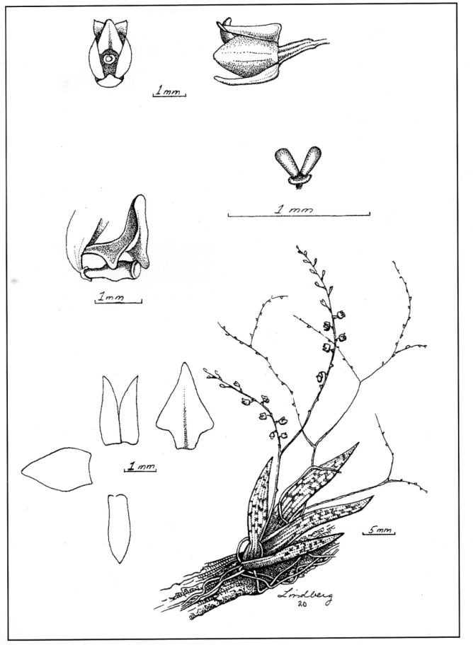 Found in Trinidad & Tobago, Venezuela, northern Brazil and Ecuador in tall trees in wet forests at elevations around 450 meters as a mini-miniature sized, hot to warm growing epiphyte with insignificant pseudobulbs envelopoed completely by imbricating, distichous leaf-bearing sheaths carrying, dorsalventrally united, flattened, light green spottted red, linear, acute leaves that blooms at most any time of the year on a paniculate, axillary, from the upper leaf bearing sheaths, to 2" [5 cm] long, succsessively several flowered inflorescence