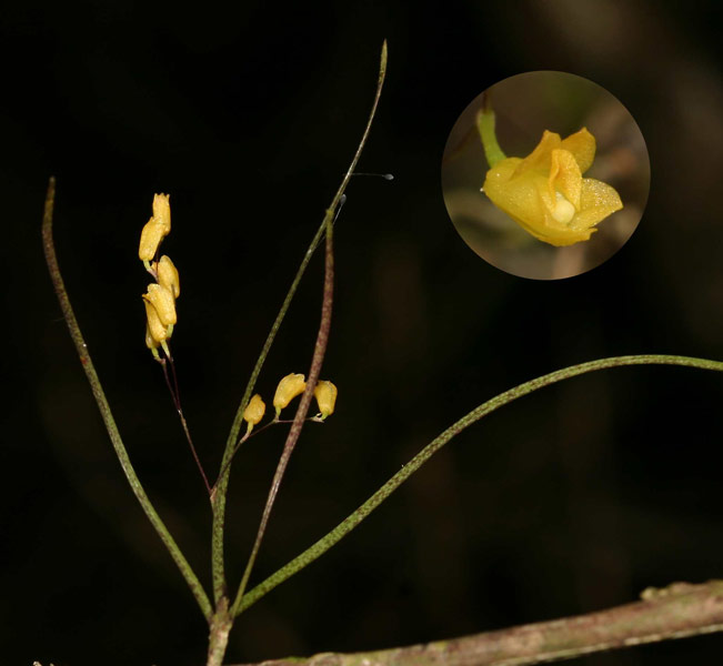 Found in Venezuela, Guyana, French Guiana, Surinam and northern Brazil at elevations of 140 to 300 meters as a mini-miniature sized, hot growing epiphyte with solid, subterete, somewhat compressed, sulcate on one side, medim rather greyish green heavily overlaid with spots of dark purple leaves that blooms in the later summer and fall on a basal, filiform, terete, dark purple, .6" [1.5 cm] long, lightly branched, few flowered inflorescence with small purple bracts.