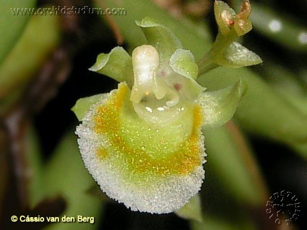 Found in Bahia, Espirito Santo and Rio de Janiero states of Brazil as a mini-miniature sized, warm growing epiphyte with a hidden pseudobulb carrying three linear, acute, becoming conduplicate below into the base leaves that blooms on a horizontal to pendant, 2.4" [6 cm] long, 8 flowered, racemose inflorescence with distant acuminate, acute, inflated floral bracts and carrying non-resupinate flowers.