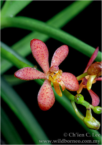 Found only in Sarawak Borneo on trees overhanging rivers and beaches at elevations of 0 to 50 meters as a medium sized, hot growing epiphyte with short, basally freely branching stems carrying distichous, linear, acute, basally clasping leaves that blooms in the summer and fall on an axillary, unbranched, [6 to 20 cm] long, successively 4 to 5 at once, to 13 flowered inflorescence