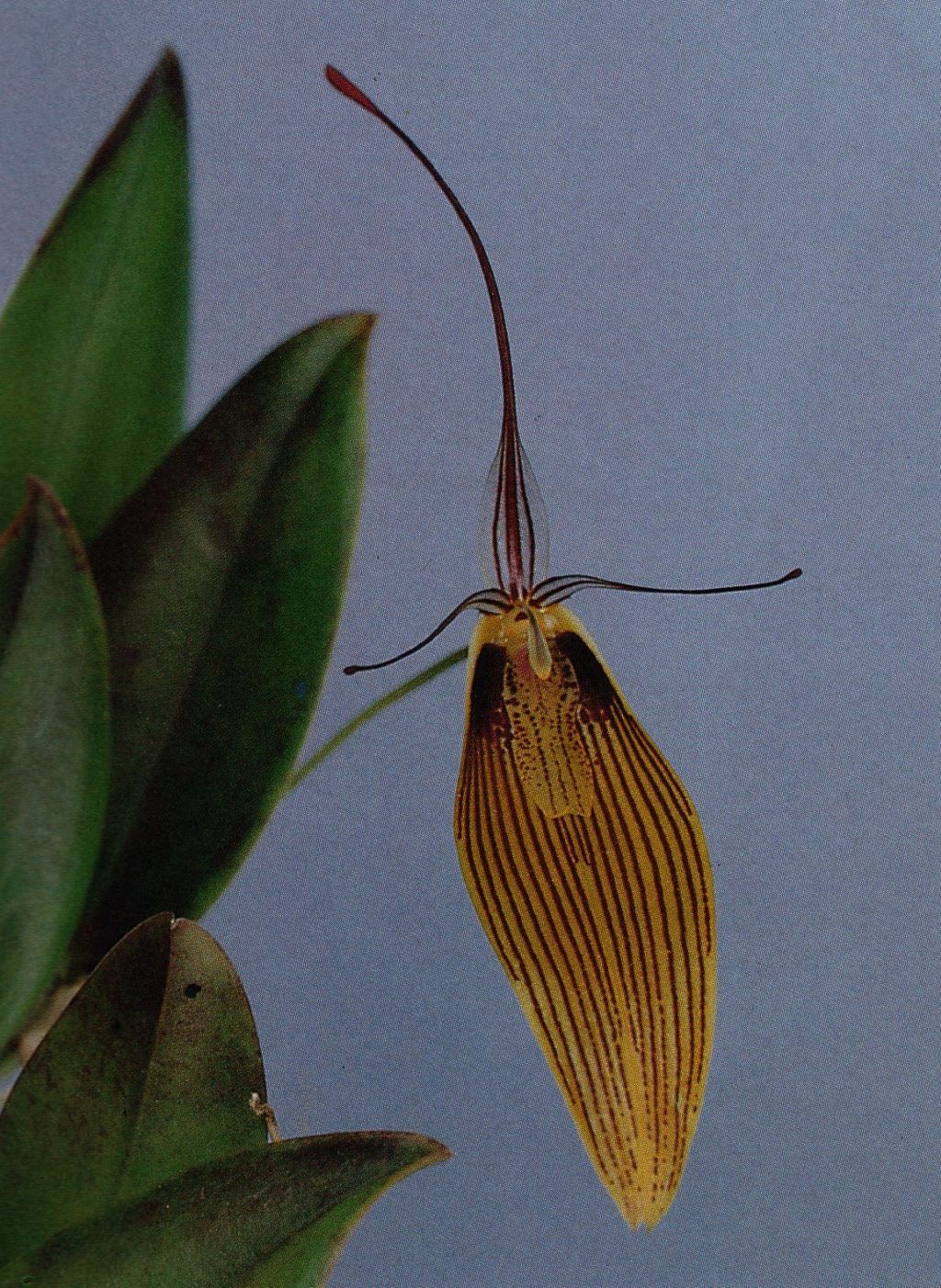 Found in Venezuela, Colombia, Ecuador and Peru in andean forests on tree trunks at elevations of 1600 to 3500 meters as a small to just medium sized, cool to cold growing, tufted epiphyte with erect stems enveloped basally by 3 to 4 purple spotted, sheathing bracts and carrying a single, apical, erect or erect-spreading, ovate or elliptic, obtuse or rounded, coriaceous leaf that blooms in the later winter and early spring and again in the late summer and early fall on 1 to 4, axillary, terete, slender, glabrous, 1.2 to 3.2" [3 to 8 cm] long, single flowered inflorescence carrying a large [for the genus] flower.