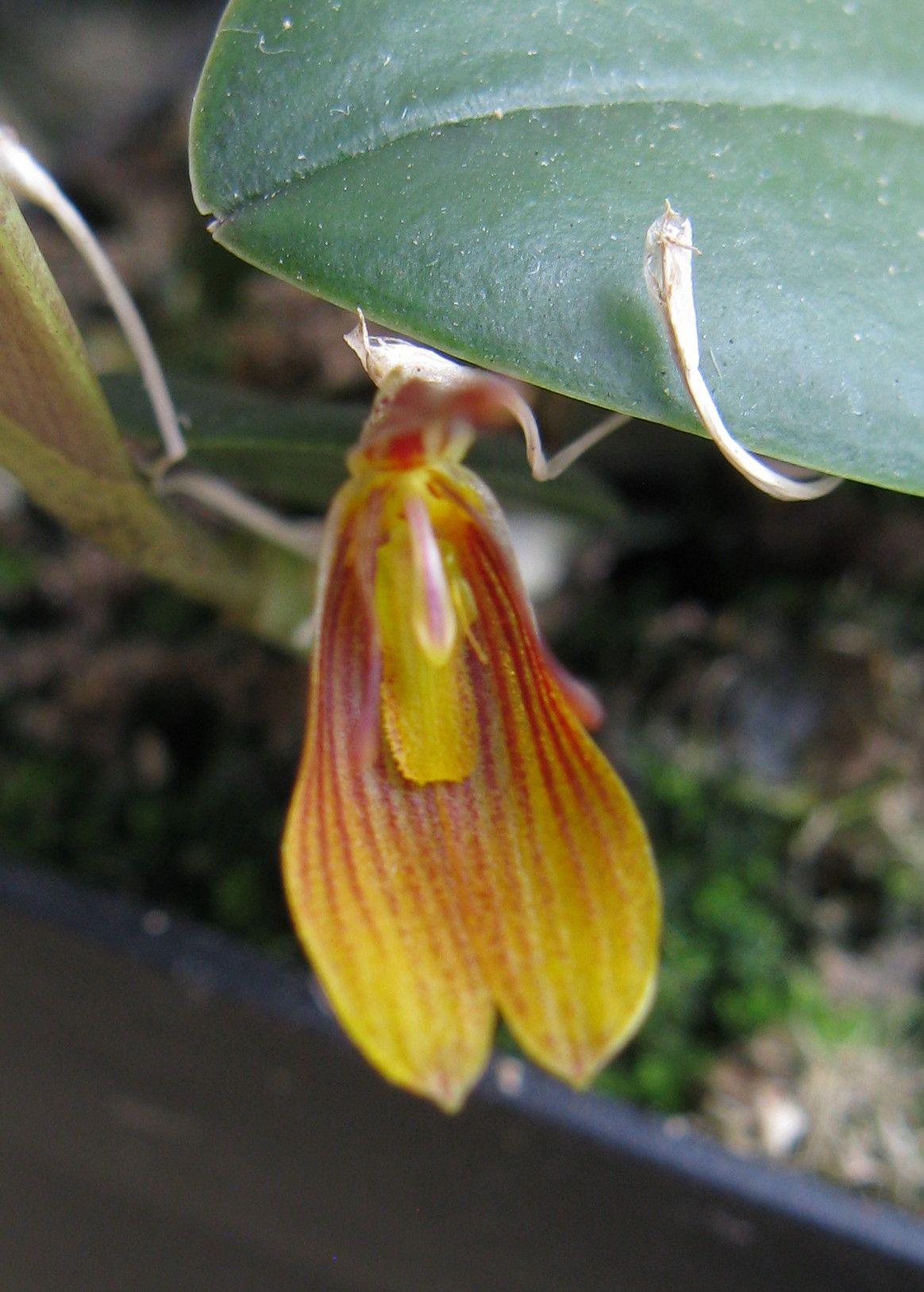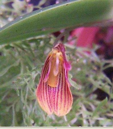 Found in Colombia and Venezuela at elevations around 1500 to 2300 meters as a miniature sized, warm growing epiphyte with erect ramicauls enveloped basally by 5 to 6 thin, whitish, loose, oblique, acute, compressed, somewhat imbricating sheaths and carrying a single, apical erect, coriaceous, ovate, subacute, basally cuneate into a twisted petiolate base leaf that blooms in the winter, spring and fall on a slender, erect, 1.2" to 1.4" [3 to 3.5 cm] long, a single flower produced successively in a fascile and has a thin, tubular floral bract. This species has the smallest flower in the genus.