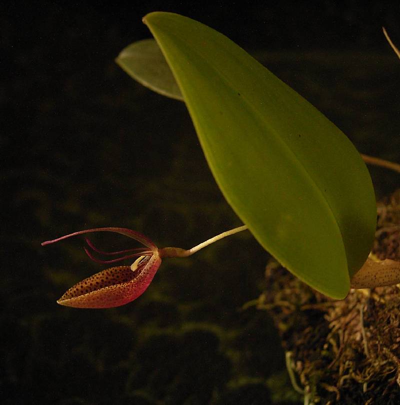 Found only in Ecuador so far not known where as a miniature sized, warm to cool growing epiphyte with erect, slender, 5 to 6, thin, whitish, loose, compressed, somewhat imbricating, distichous sheaths and carrying a single, apical, erect, coriaceous, purple spotted beneath, elliptical, obtuse, basally rounded and sessile leaf that blooms in the winter and spring on a slender, .4 to .8" [1 to 2 cm] long, successively single flowered infloresence held in a fascile, arising from the back of the leaf and carrying a thin, oblique floral bract.